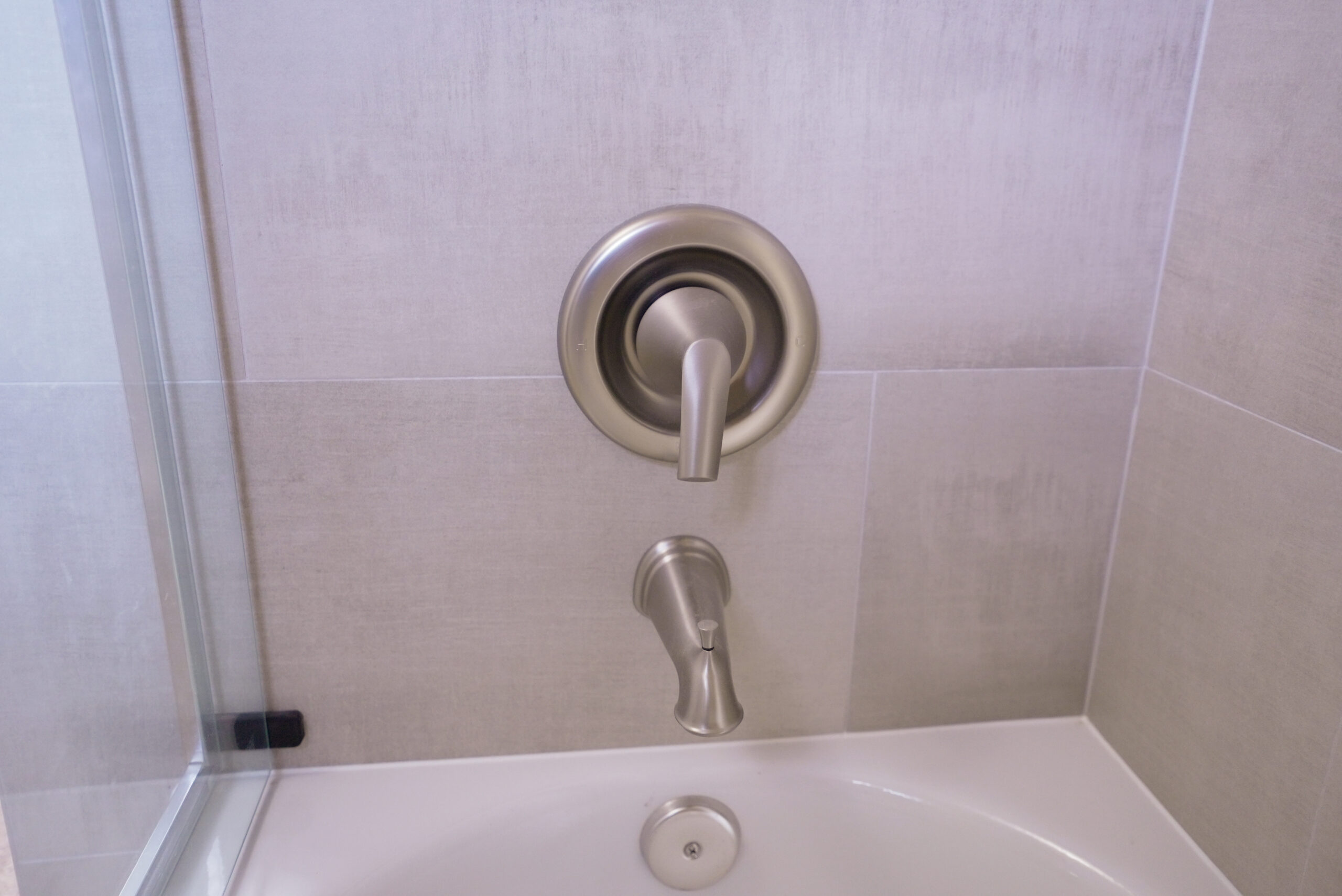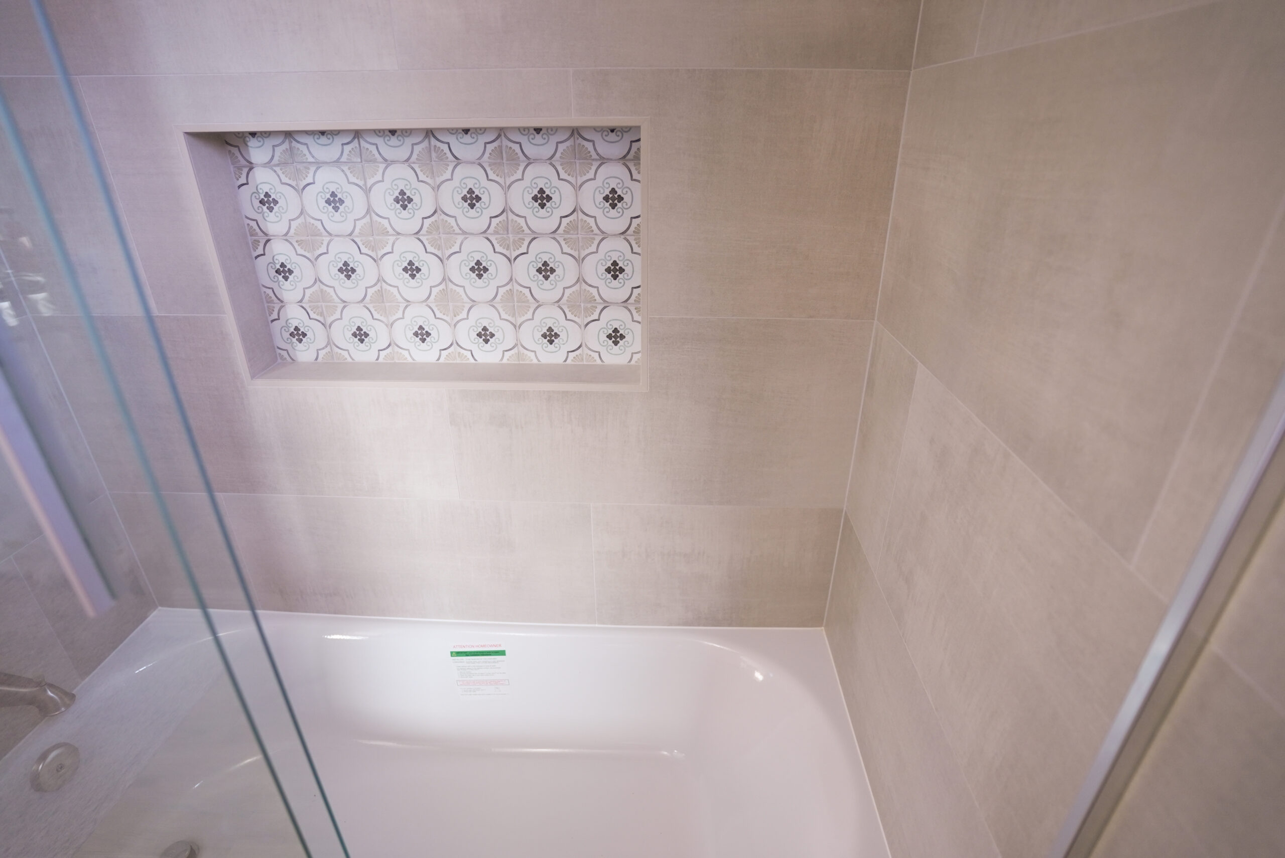 For the master bathroom, we addressed a leakage issue by replacing the bathtub and correcting faulty plumbing. We ensured proper waterproofing, installed elegant tile up to the ceiling, incorporated a spacious shampoo niche, and completed the look with a high-quality glass installation.