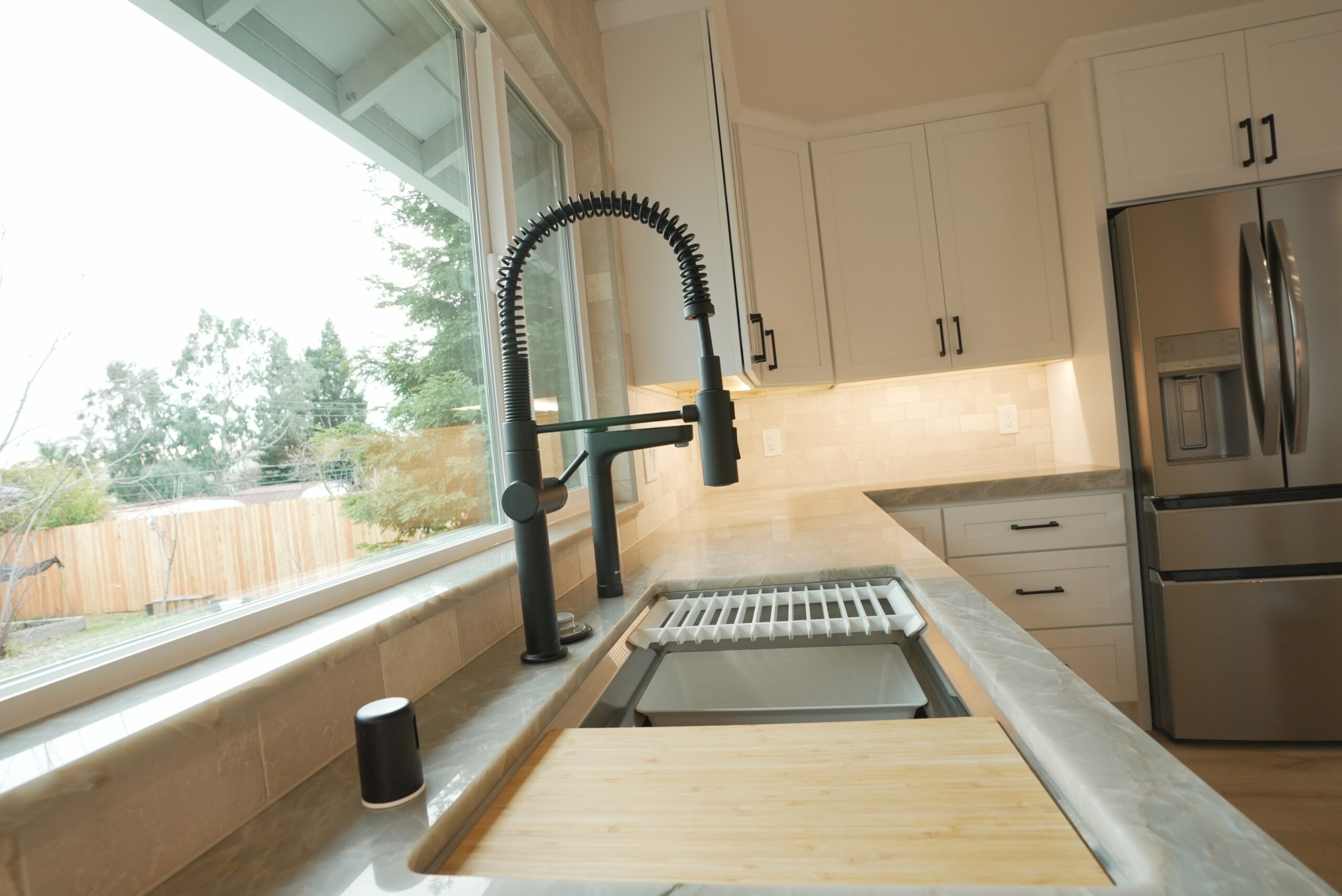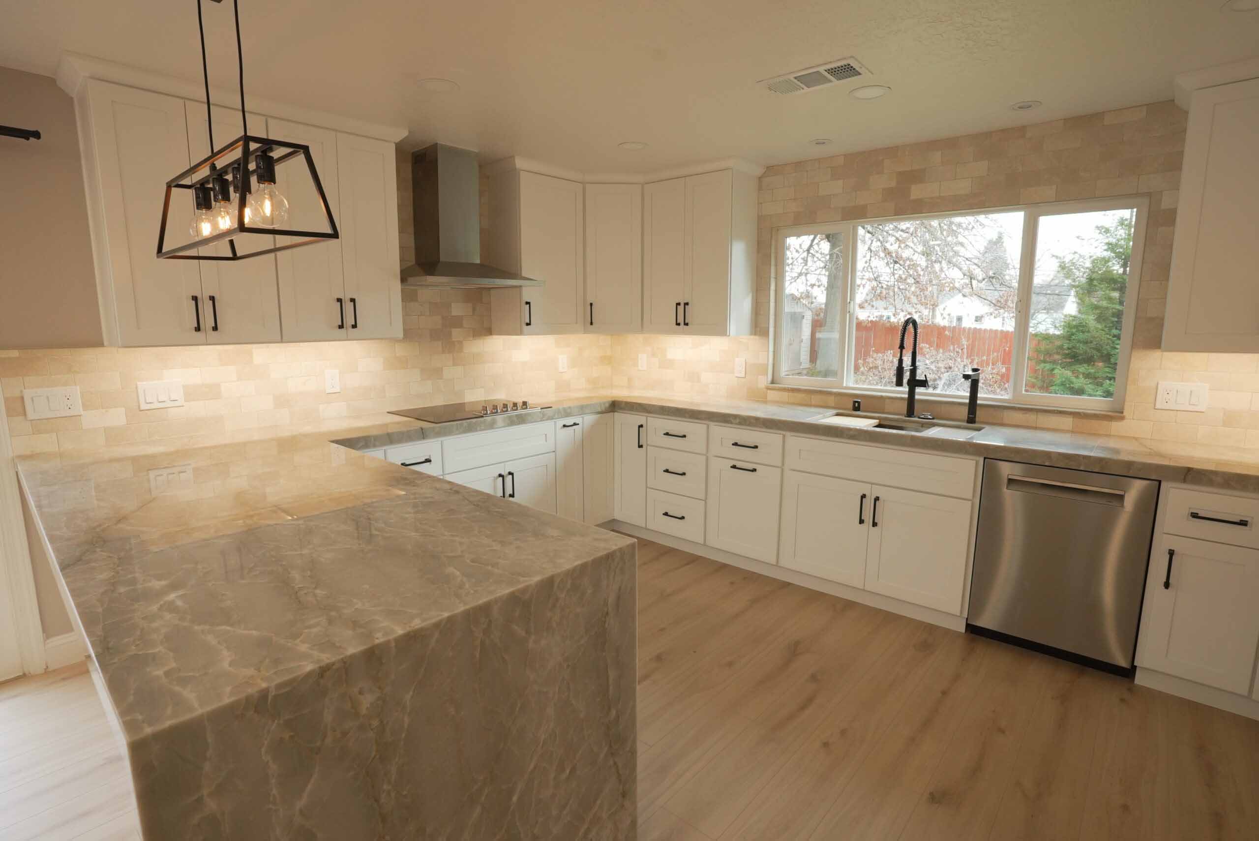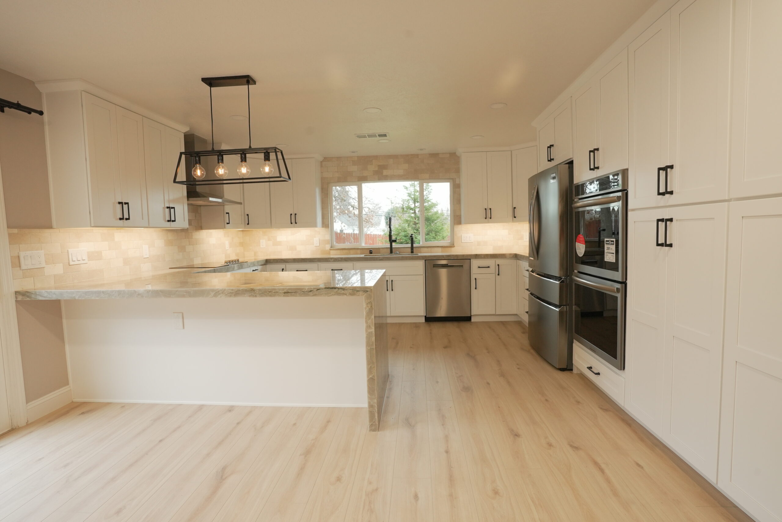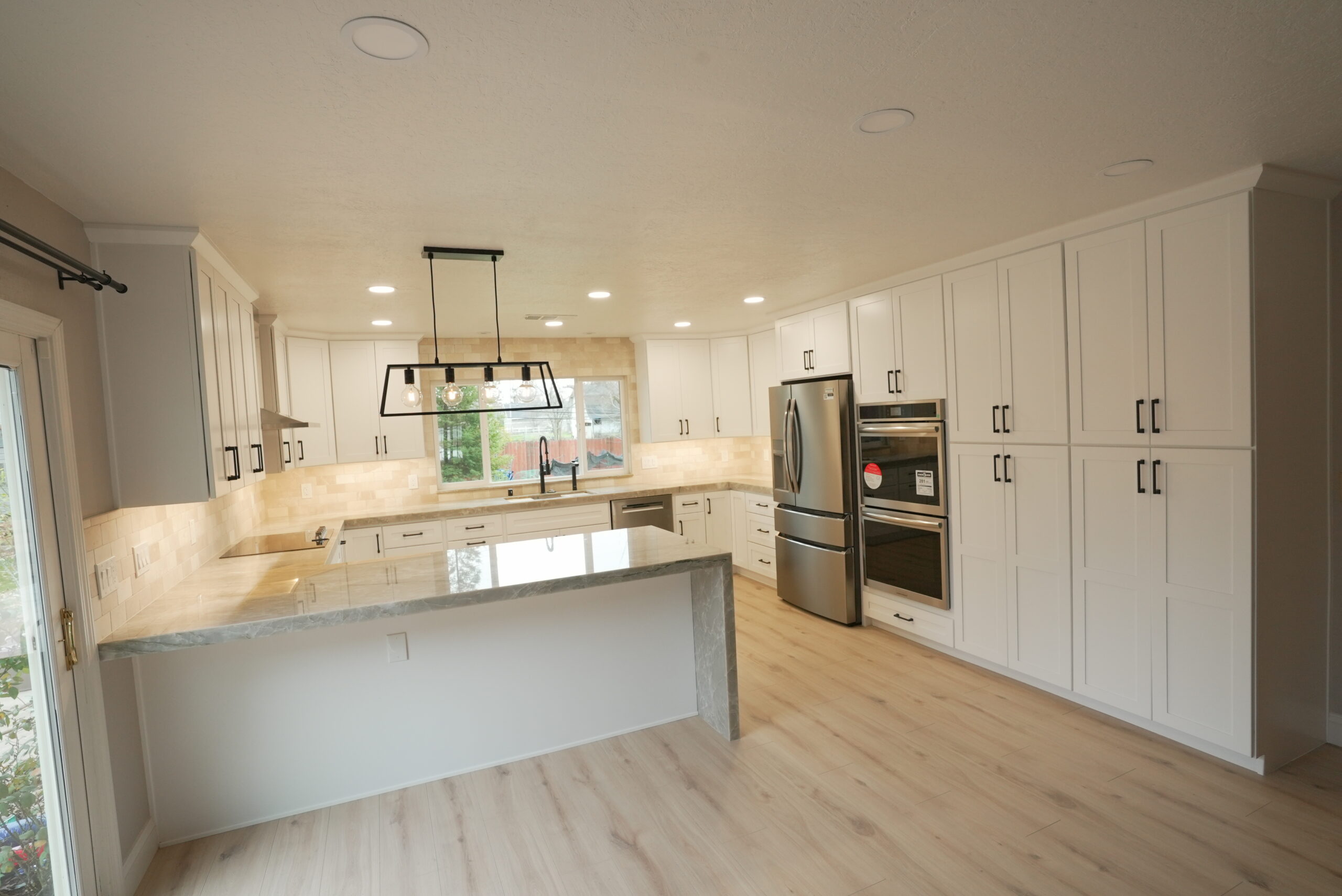 To enhance the kitchen’s functionality, we relocated it from a smaller room to a larger space, making use of the extra area available. The result is a spacious, highly functional kitchen featuring a beautiful quartzite countertop, sleek stainless steel appliances, black hardware on white shaker-style cabinets, and a large window over the sink that brings in plenty of natural light. We also installed additional lighting to create a bright and cozy atmosphere.