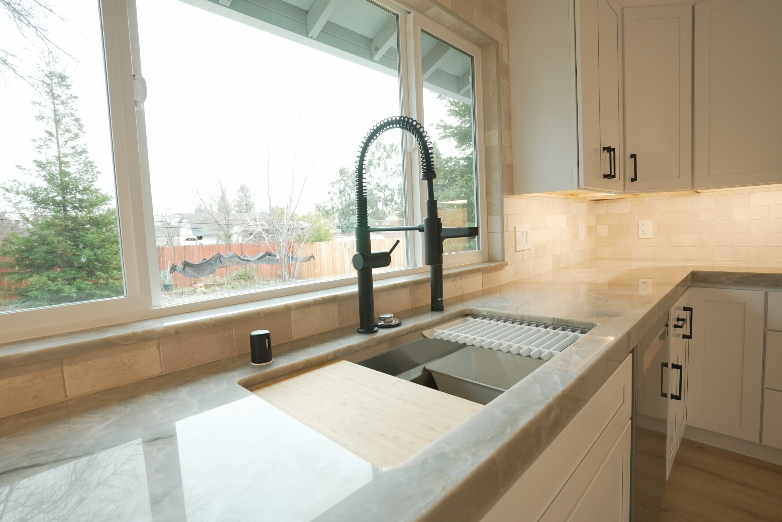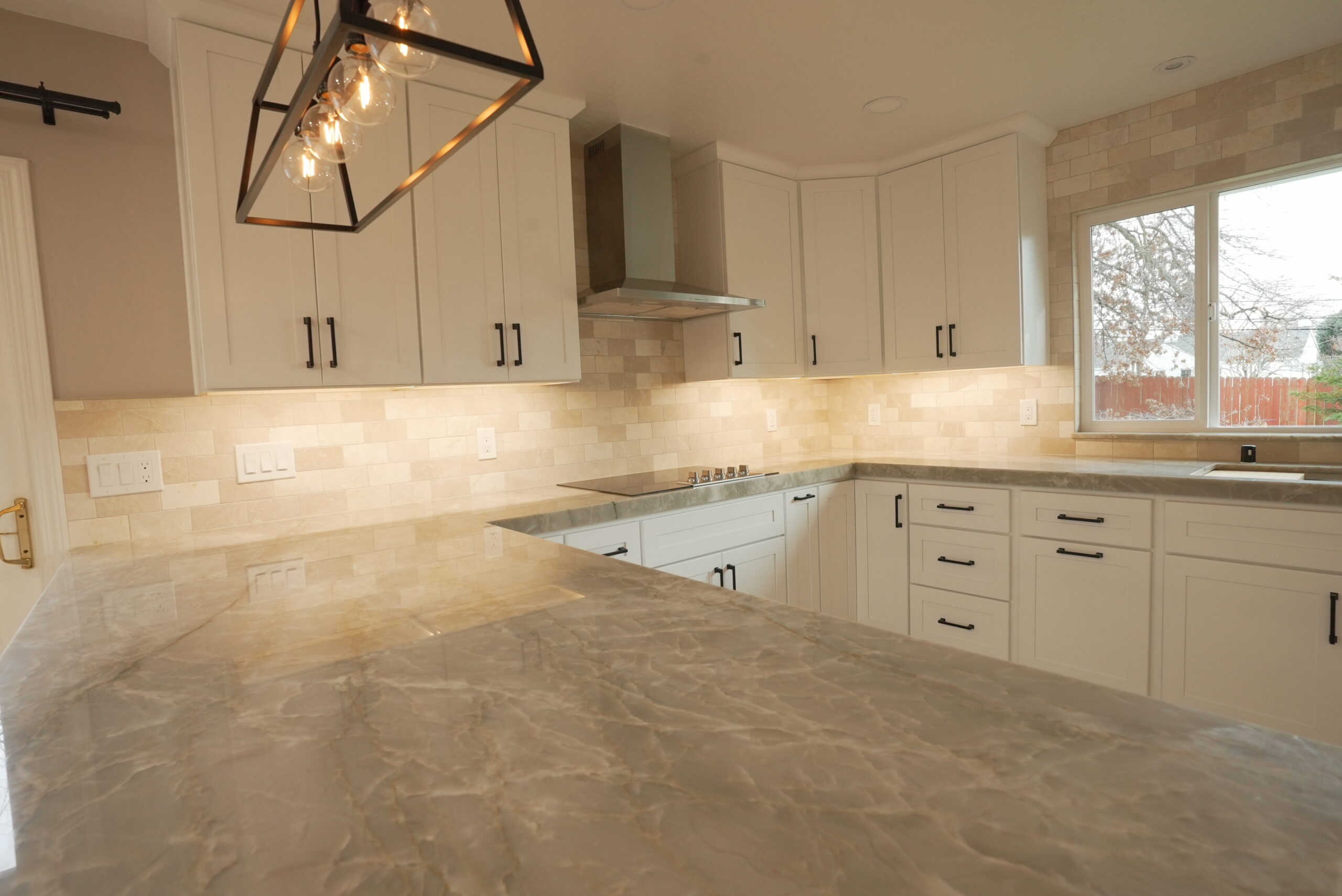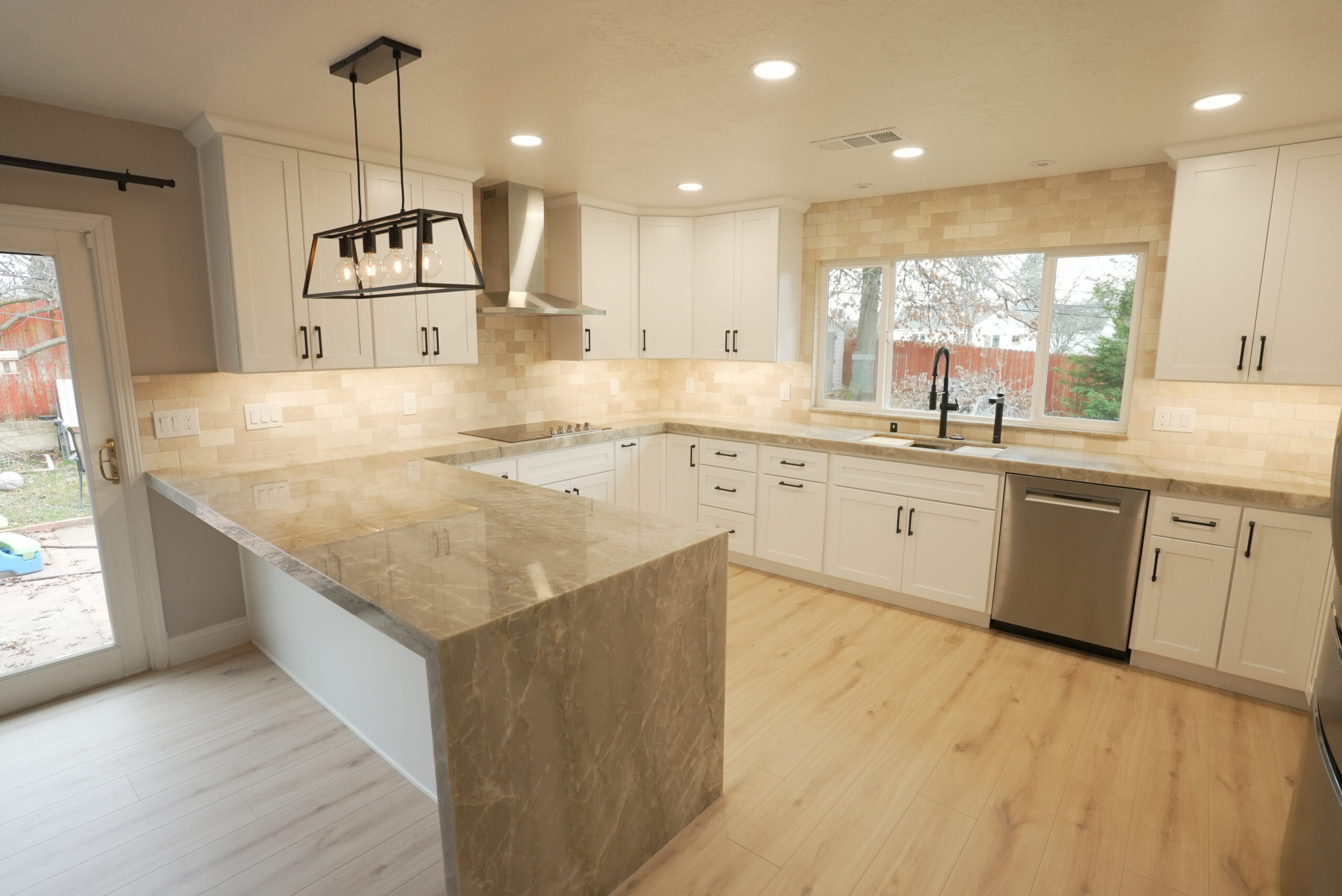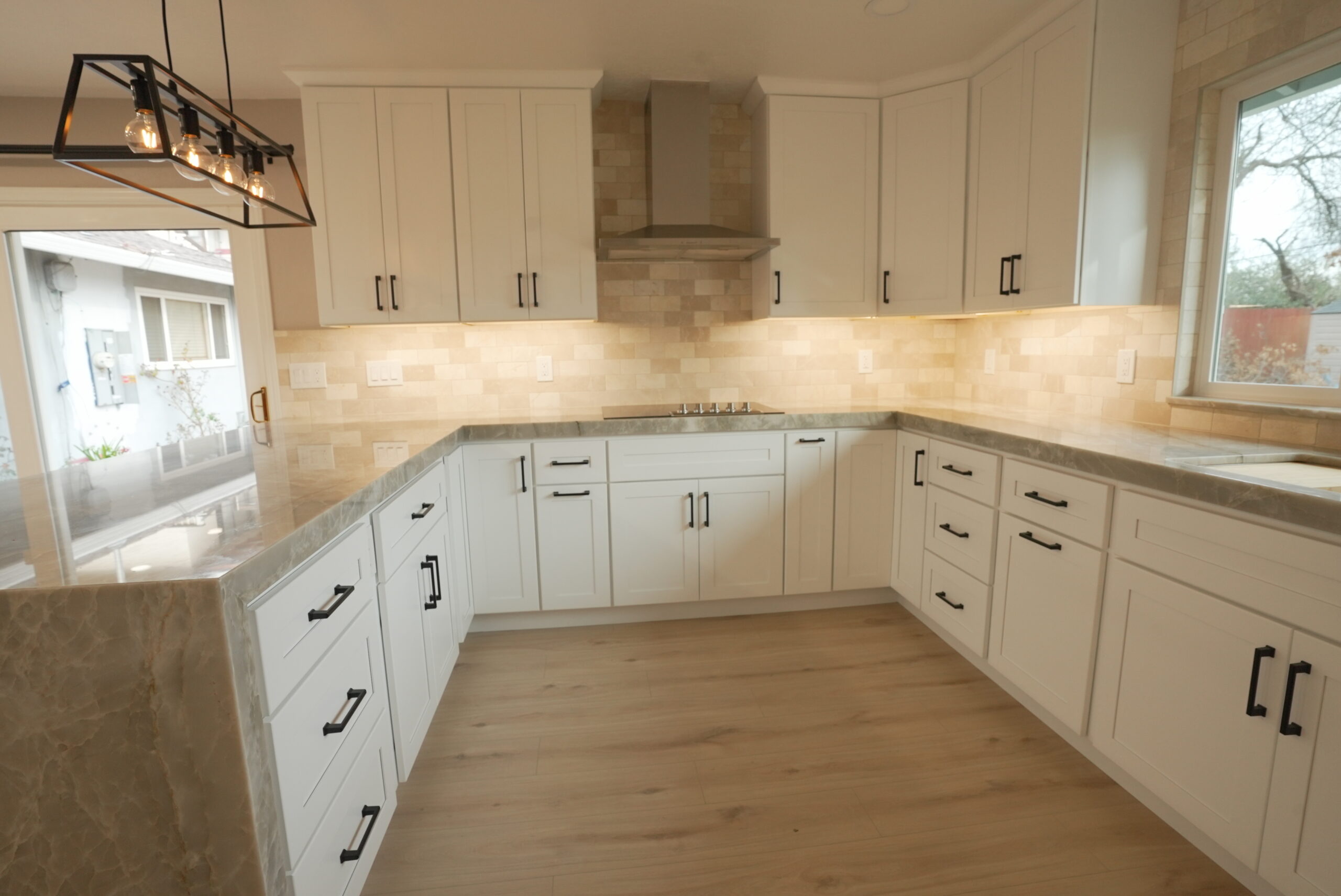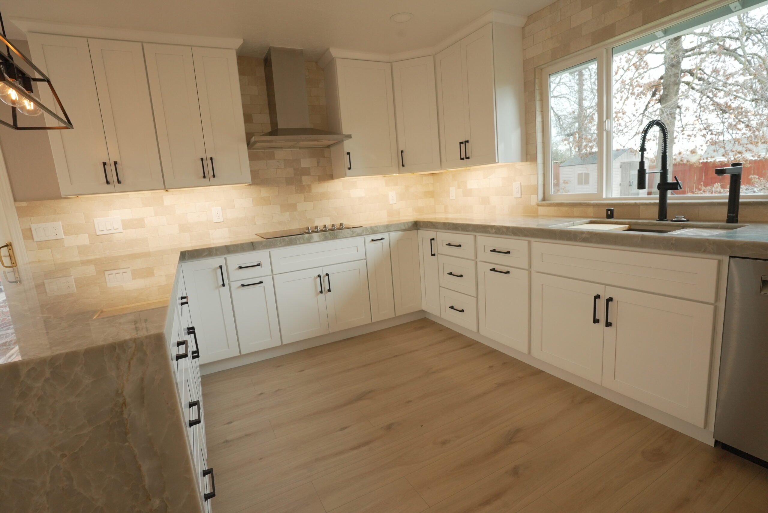 To enhance the kitchen’s functionality, we relocated it from a smaller room to a larger space, making use of the extra area available. The result is a spacious, highly functional kitchen featuring a beautiful quartzite countertop, sleek stainless steel appliances, black hardware on white shaker-style cabinets, and a large window over the sink that brings in plenty of natural light. We also installed additional lighting to create a bright and cozy atmosphere.