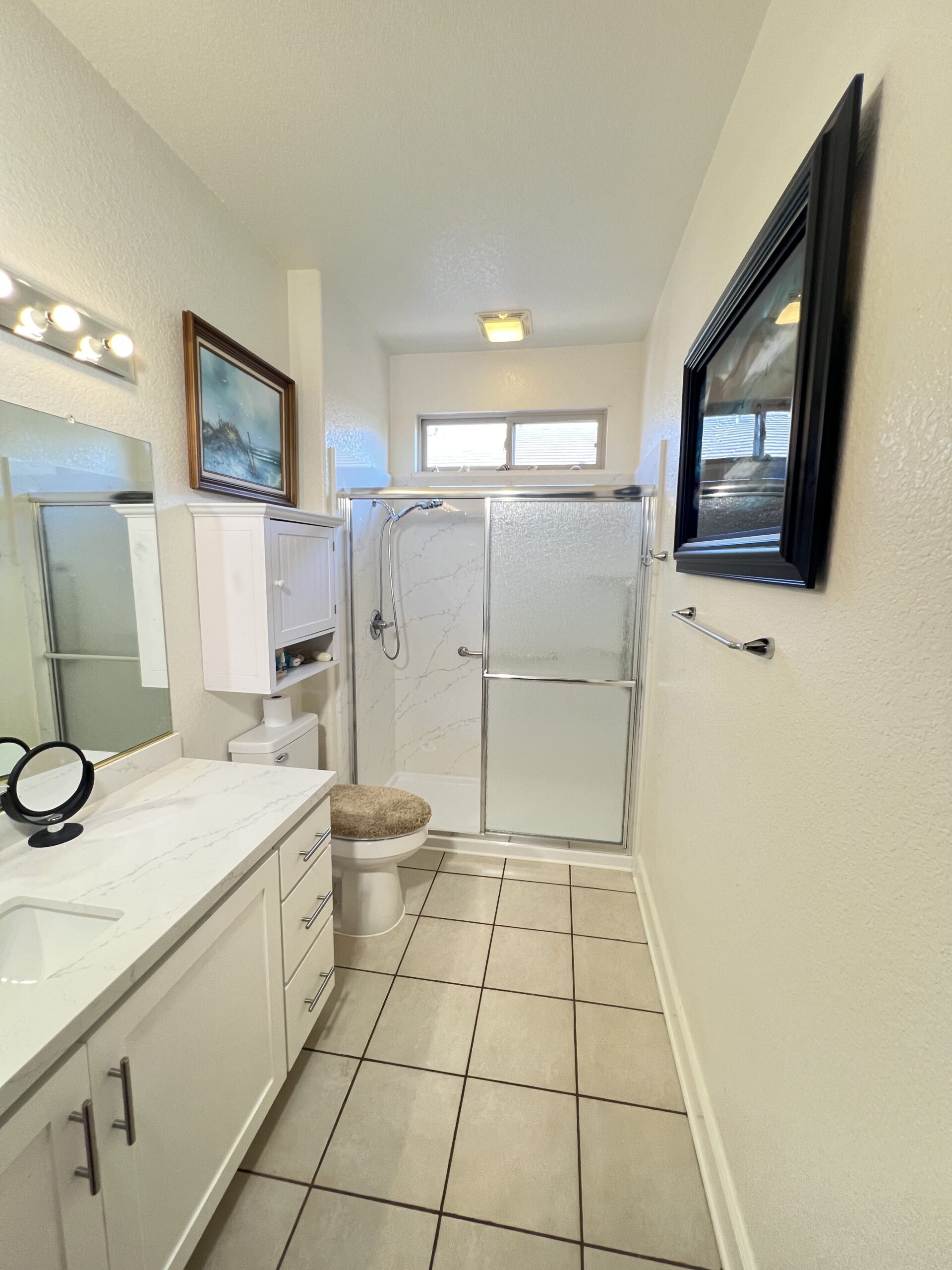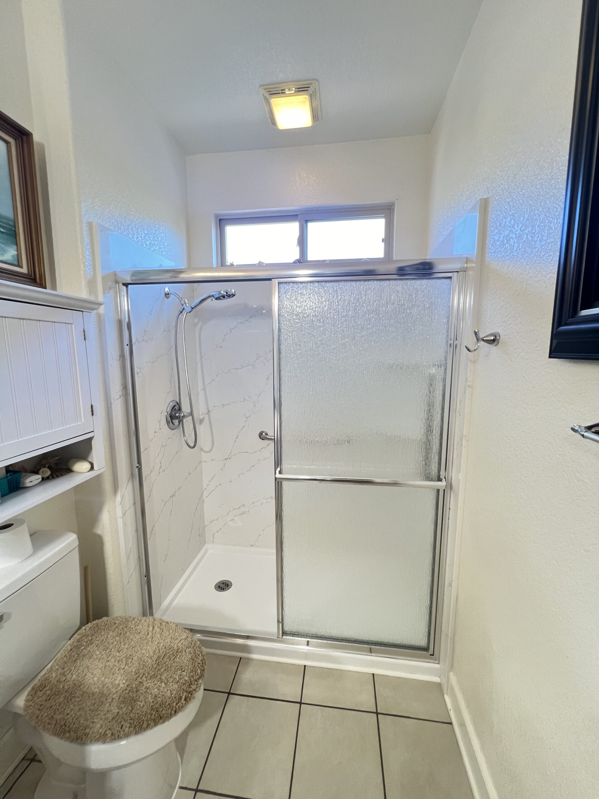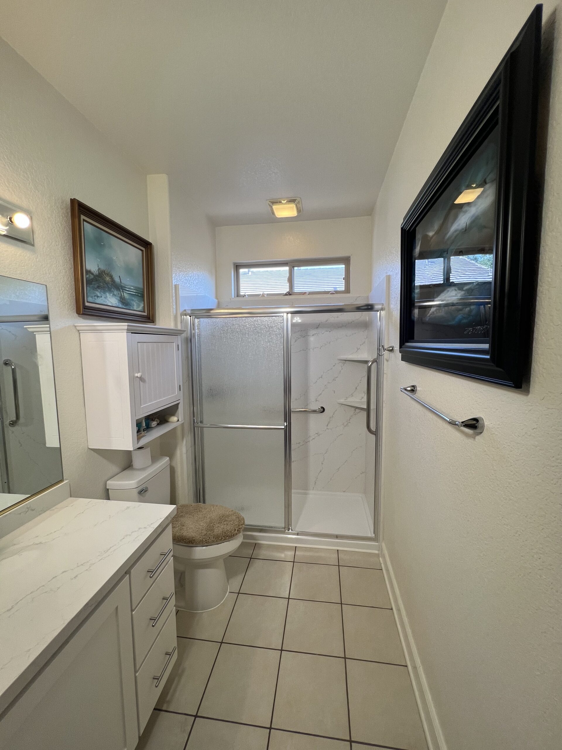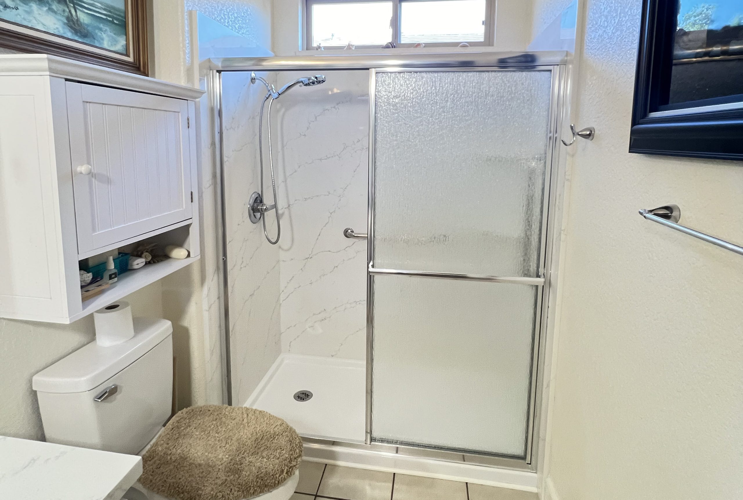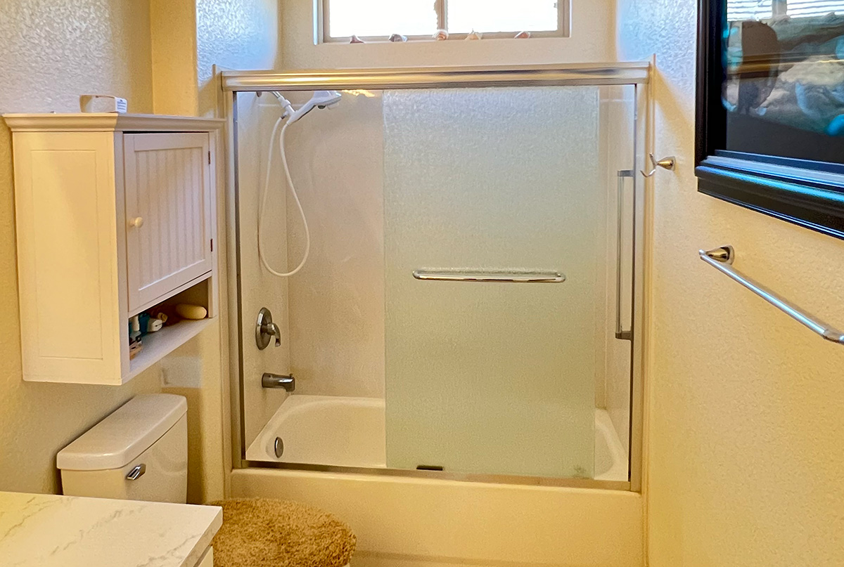 We completed a bathtub-to-shower conversion for Carolyn in Lincoln. The project featured custom-made quartz shower panels and the installation of grab bars to meet her specific needs for safety and convenience. She selected a plastic shower pan because it offered the lowest threshold, making it comfortable and easy to step into the shower.