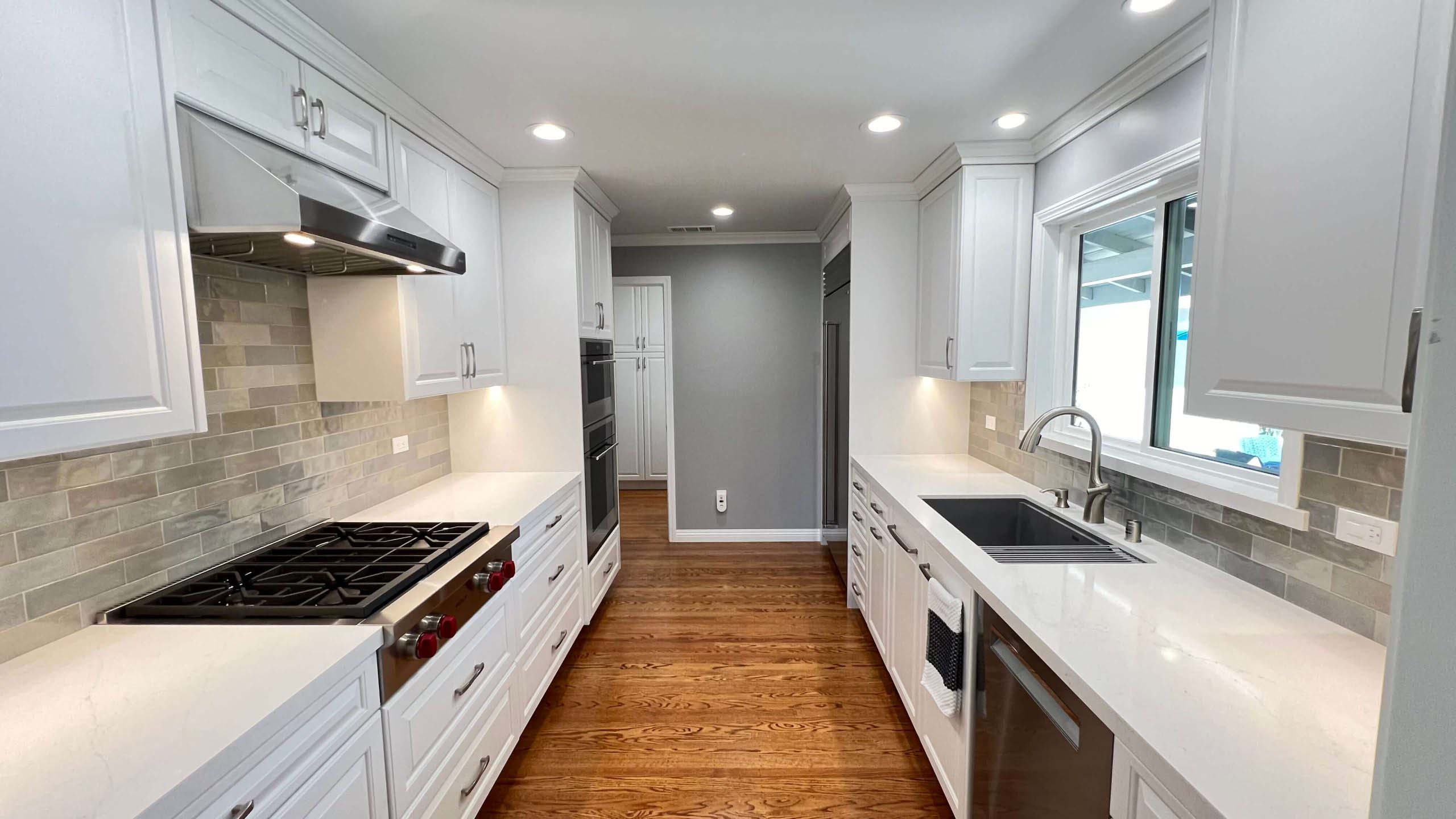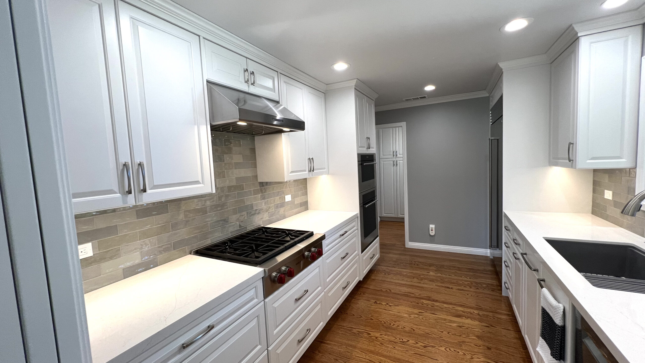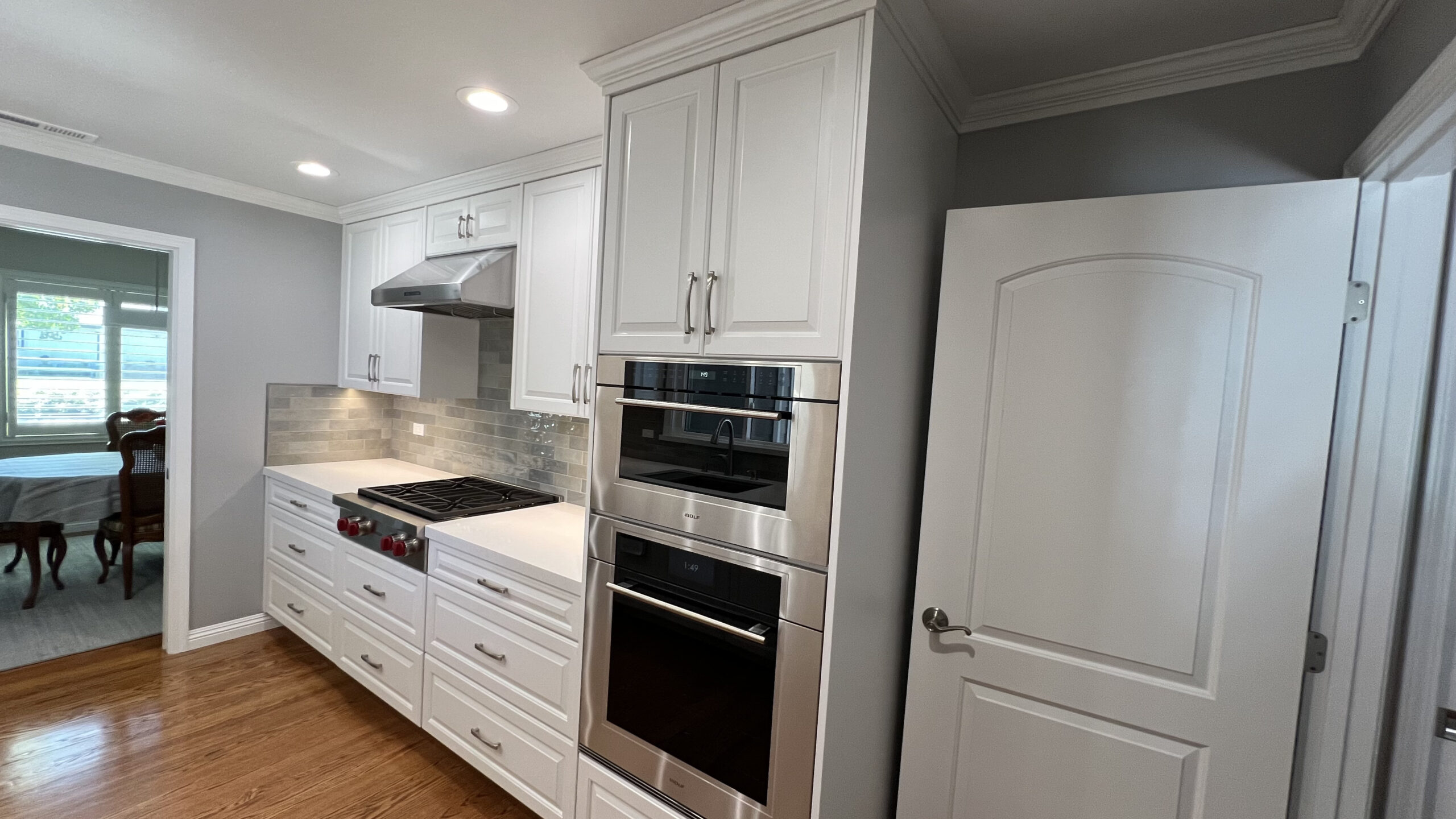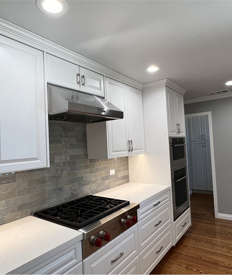 Hardwood flooring was laid to add warmth and elegance to the space. A tile backsplash and custom quartz countertops were added for a modern touch. Recessed LED lighting was installed to brighten the kitchen. We replaced the microwave ventilation with a range hood for better ventilation capability and a better look.