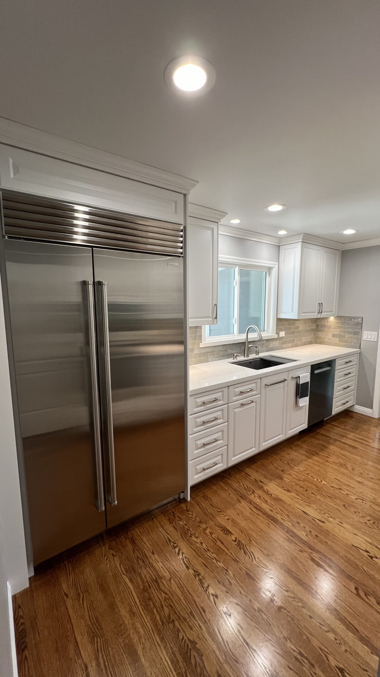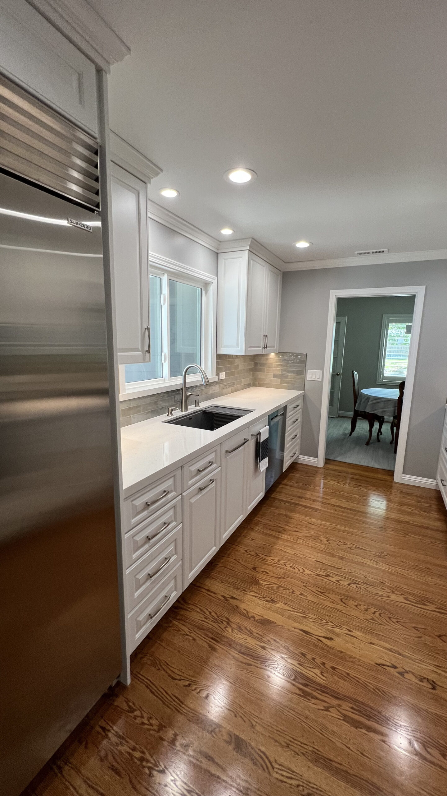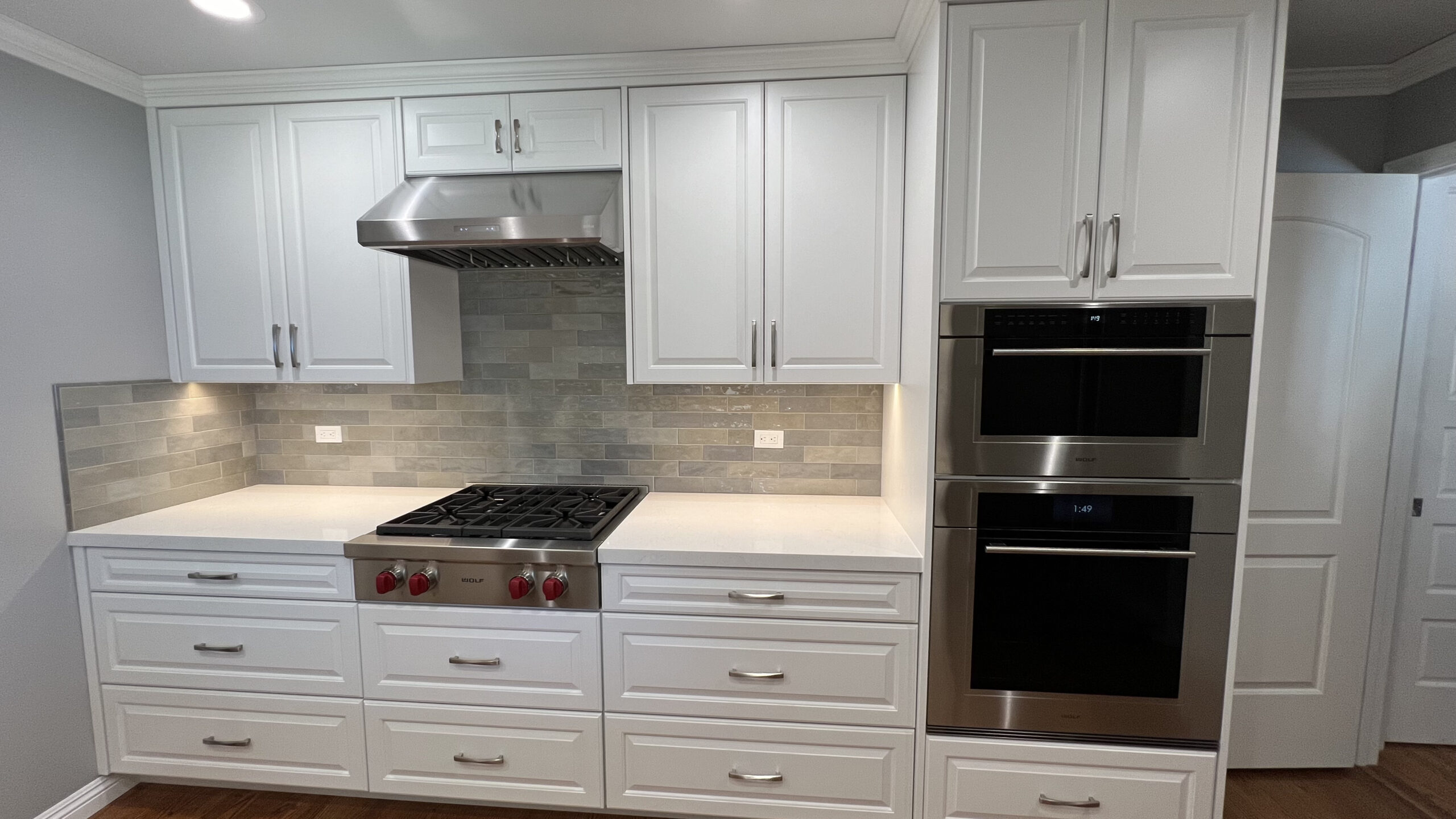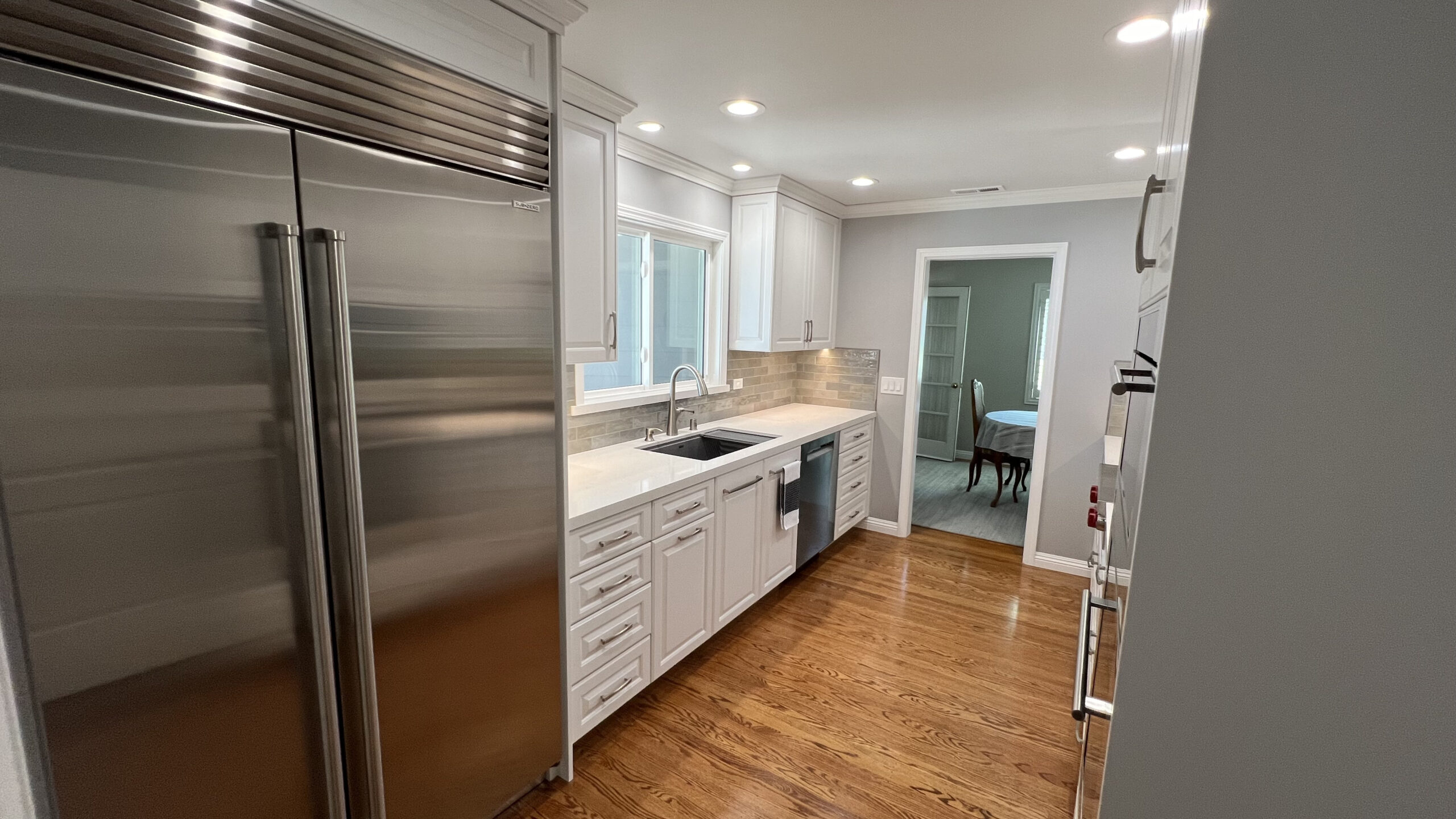 Hardwood flooring was laid to add warmth and elegance to the space. A tile backsplash and custom quartz countertops were added for a modern touch. Recessed LED lighting was installed to brighten the kitchen. We replaced the microwave ventilation with a range hood for better ventilation capability and a better look.