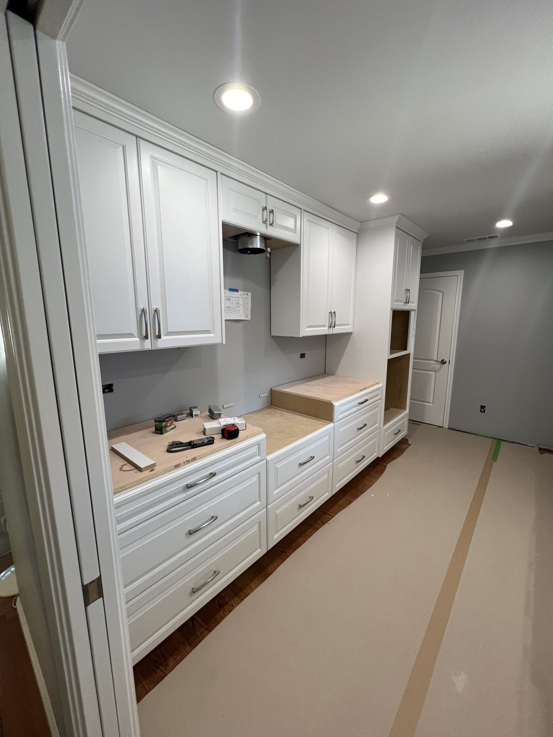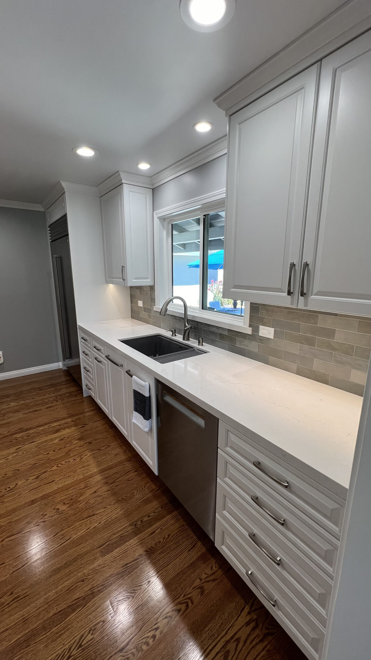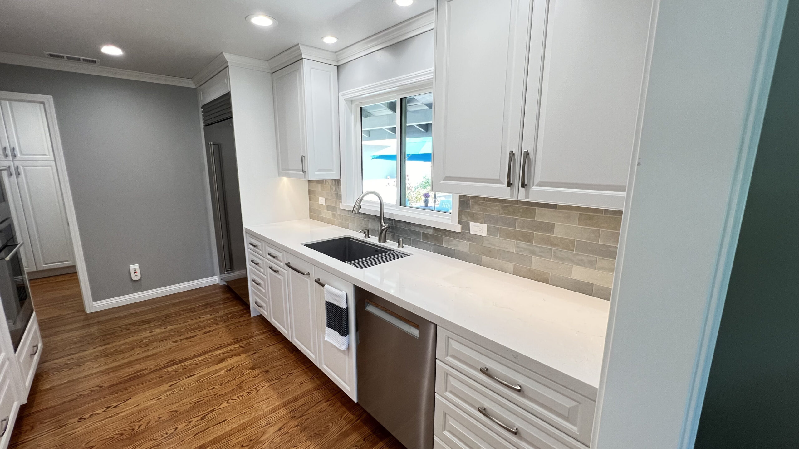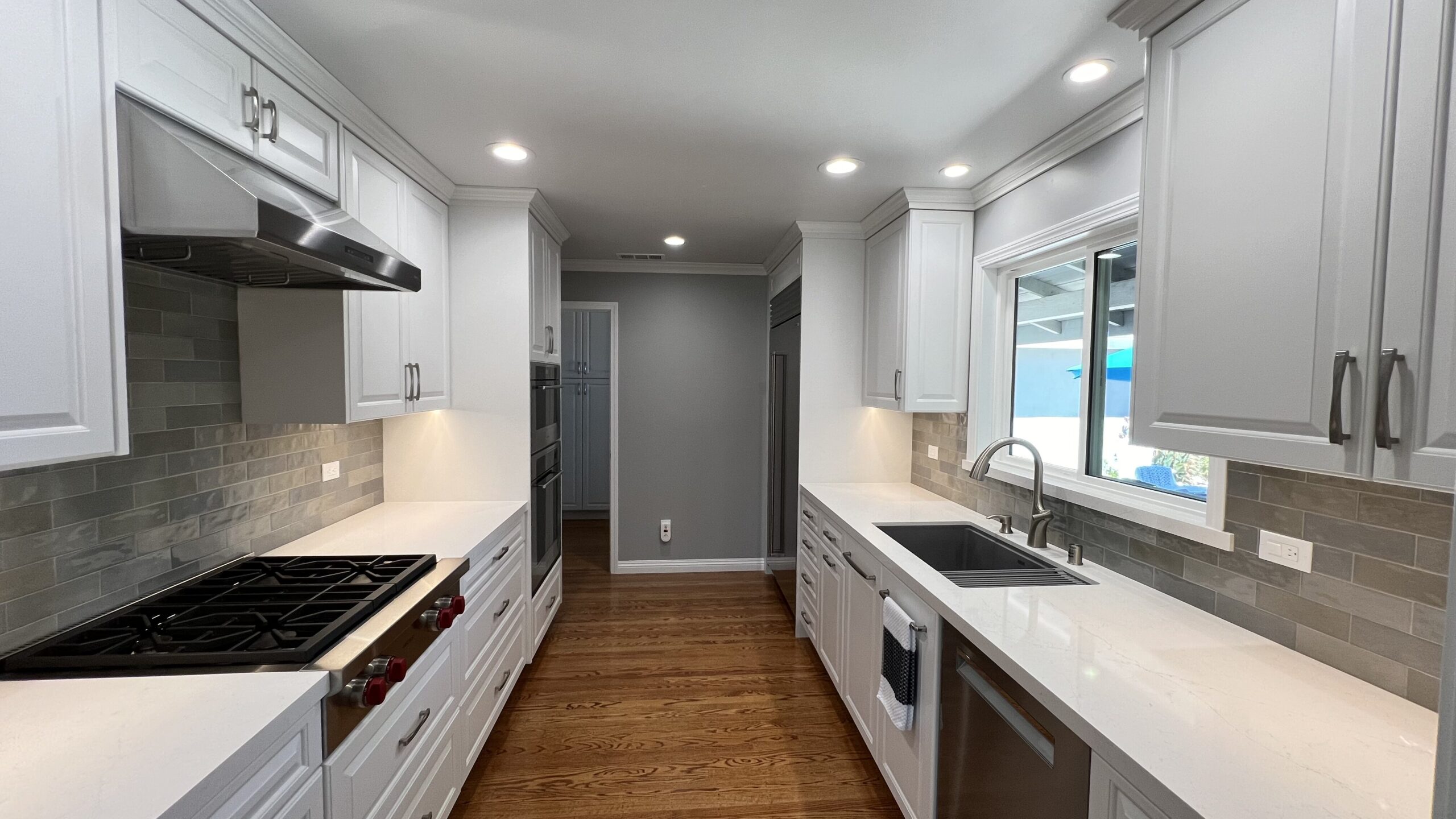 Hardwood flooring was laid to add warmth and elegance to the space. A tile backsplash and custom quartz countertops were added for a modern touch. Recessed LED lighting was installed to brighten the kitchen. We replaced the microwave ventilation with a range hood for better ventilation capability and a better look.